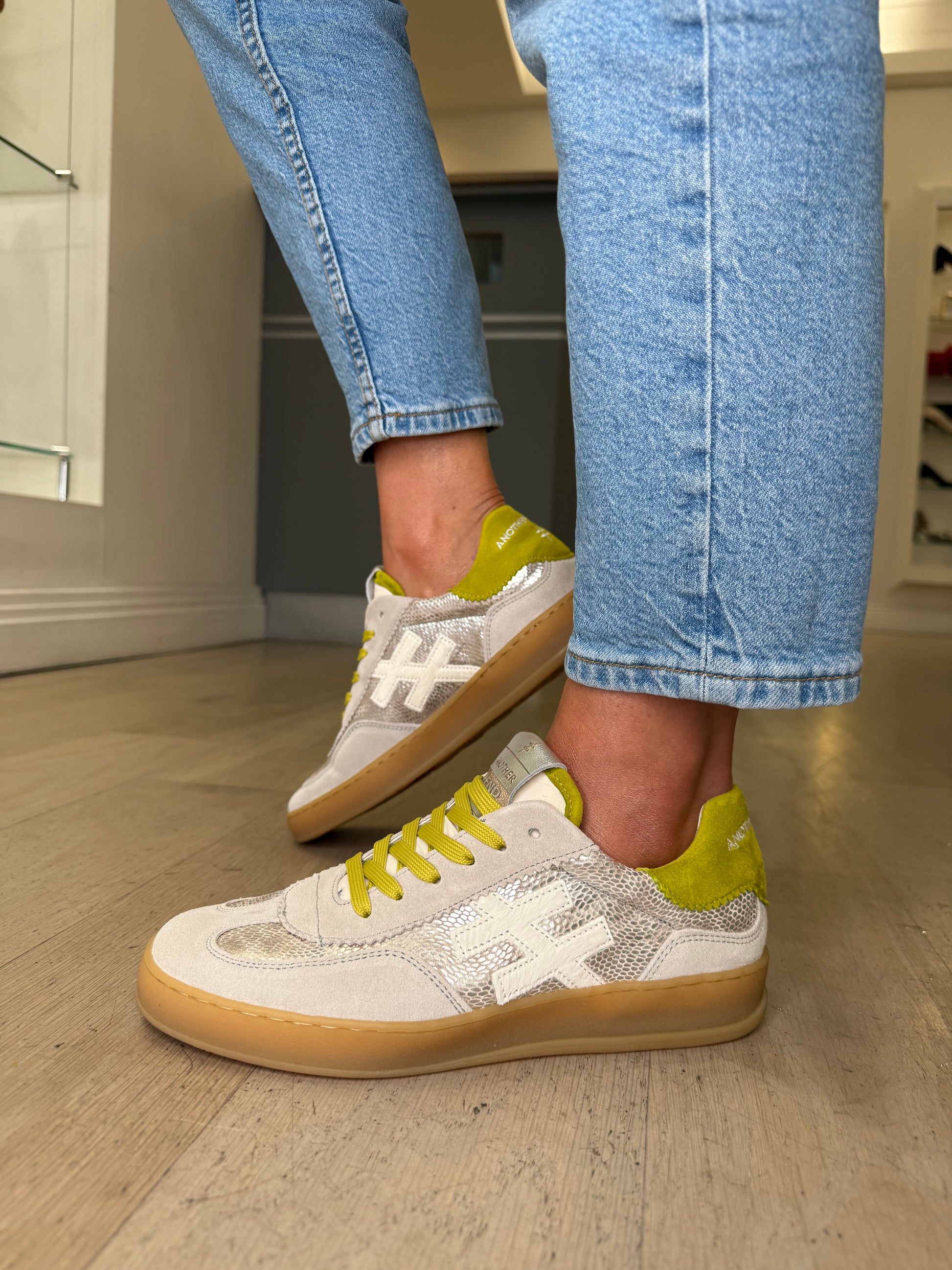 Another Trend - Stone Grey Suede Trainer With Silver Snake Print Shimmer & Lime Suede Trim