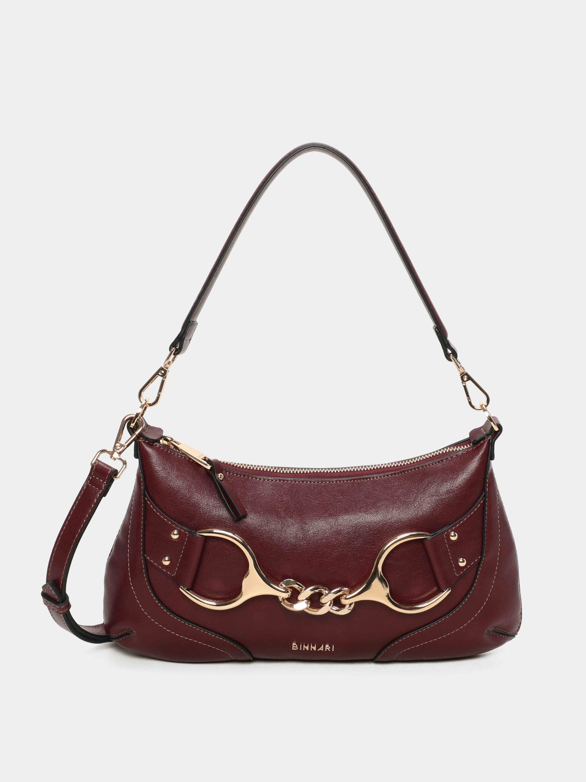 Refined elegance meets modern edge with the Binnari Fanny Shoulder Bag in this rich burgundy. Designed for women who appreciate timeless sophistication, this piece stands out with its sleek silhouette and signature metallic detail across the front — a bold accent that adds instant allure.