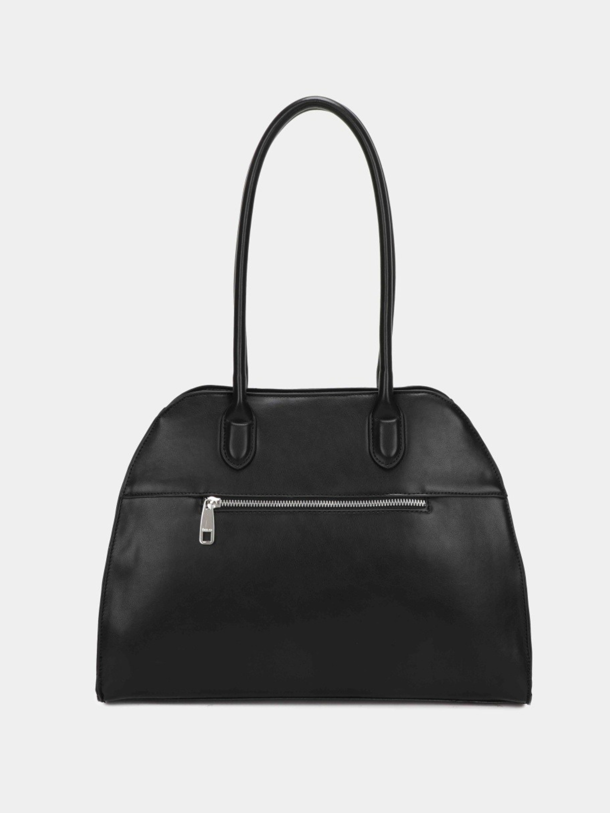 Make a statement with the Binnari "Glen" shoulder bag in perennial noir black. This large tote features a sleek, structured silhouette with a luxurious smooth finish that commands attention.