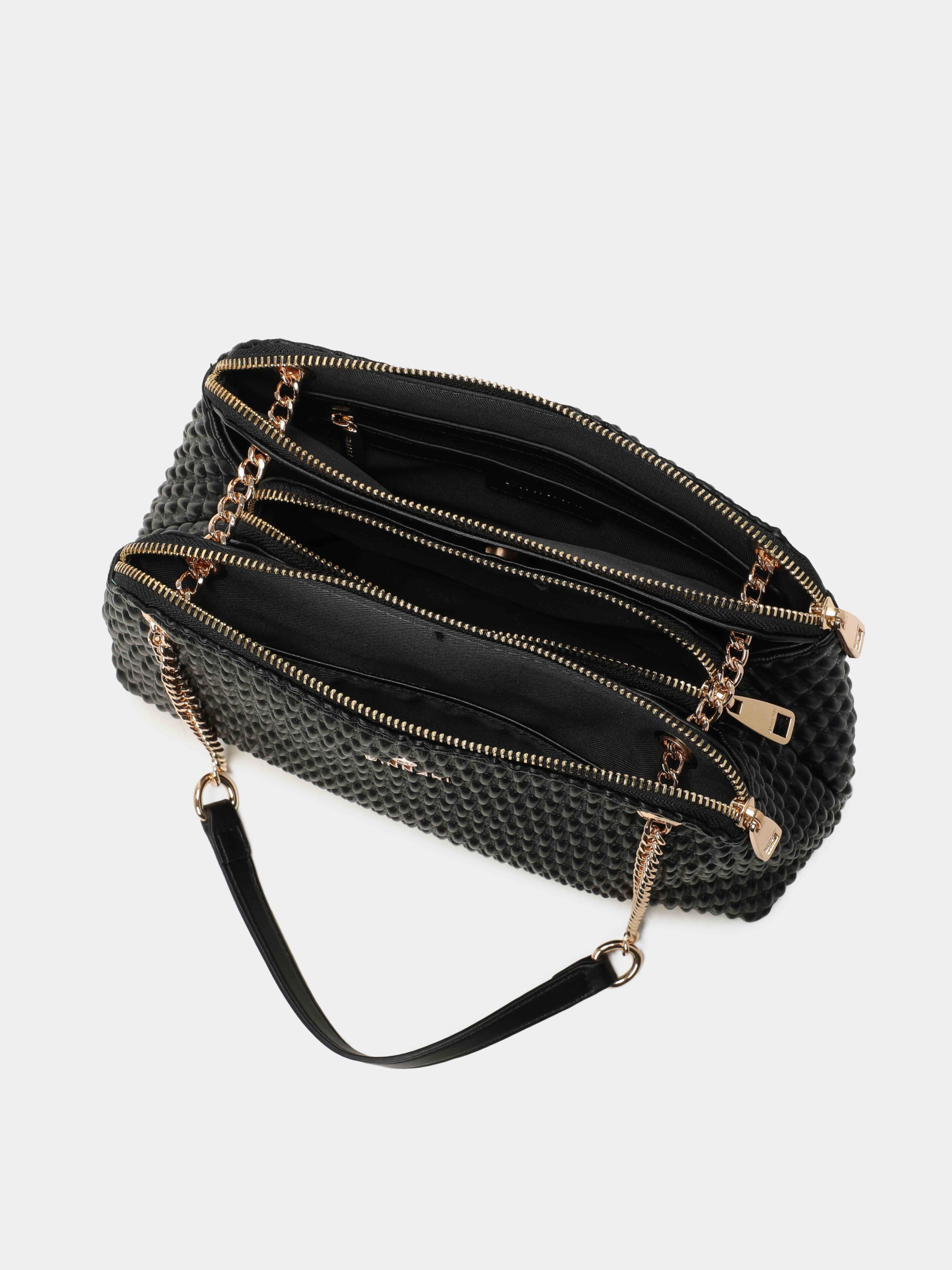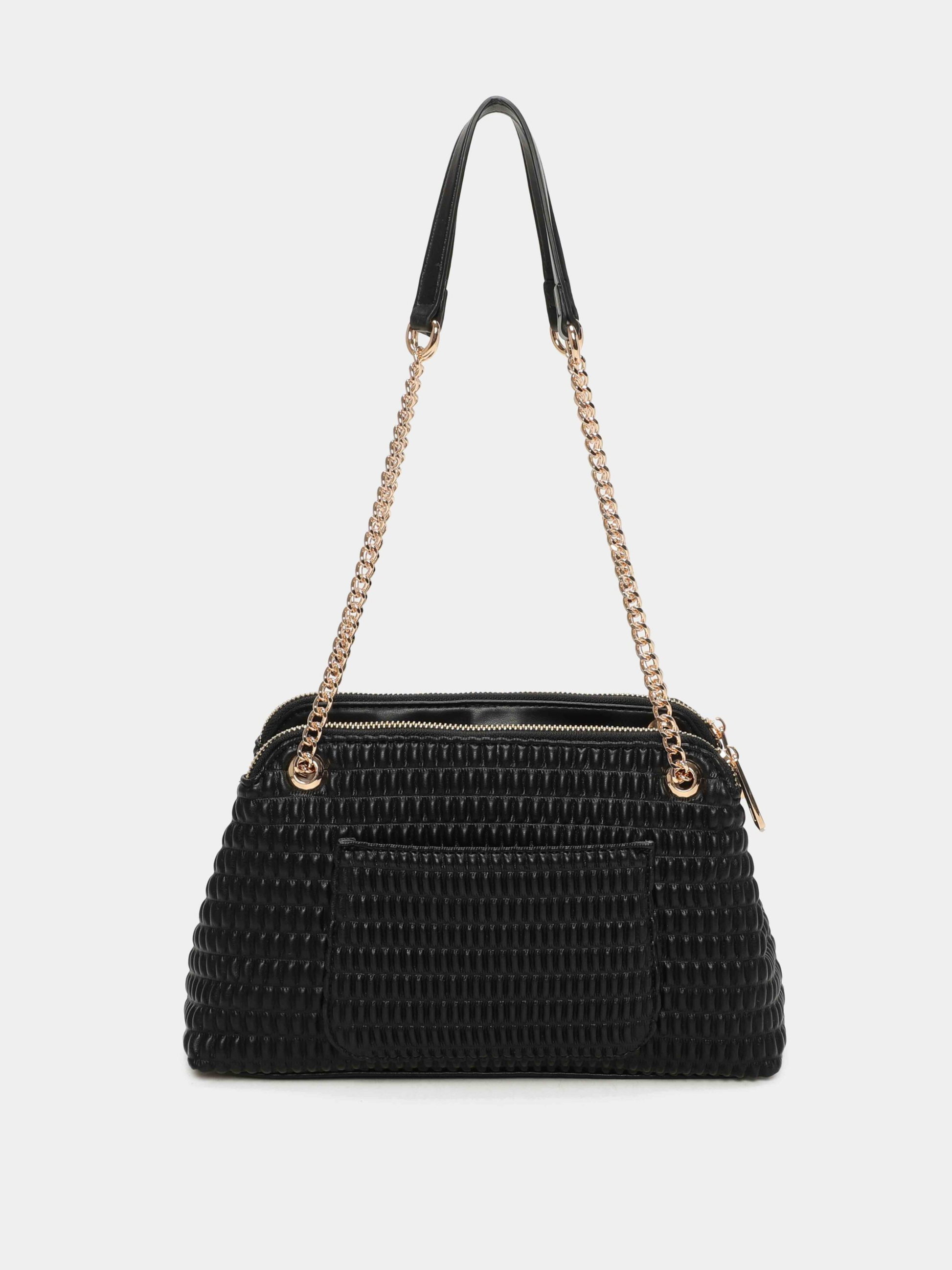 Timeless sophistication meets everyday functionality with the Binnari Patti Shoulder Bag in Black. Featuring a distinctive woven texture and elegant gold-tone hardware, this bag is designed to elevate your look from day to night.