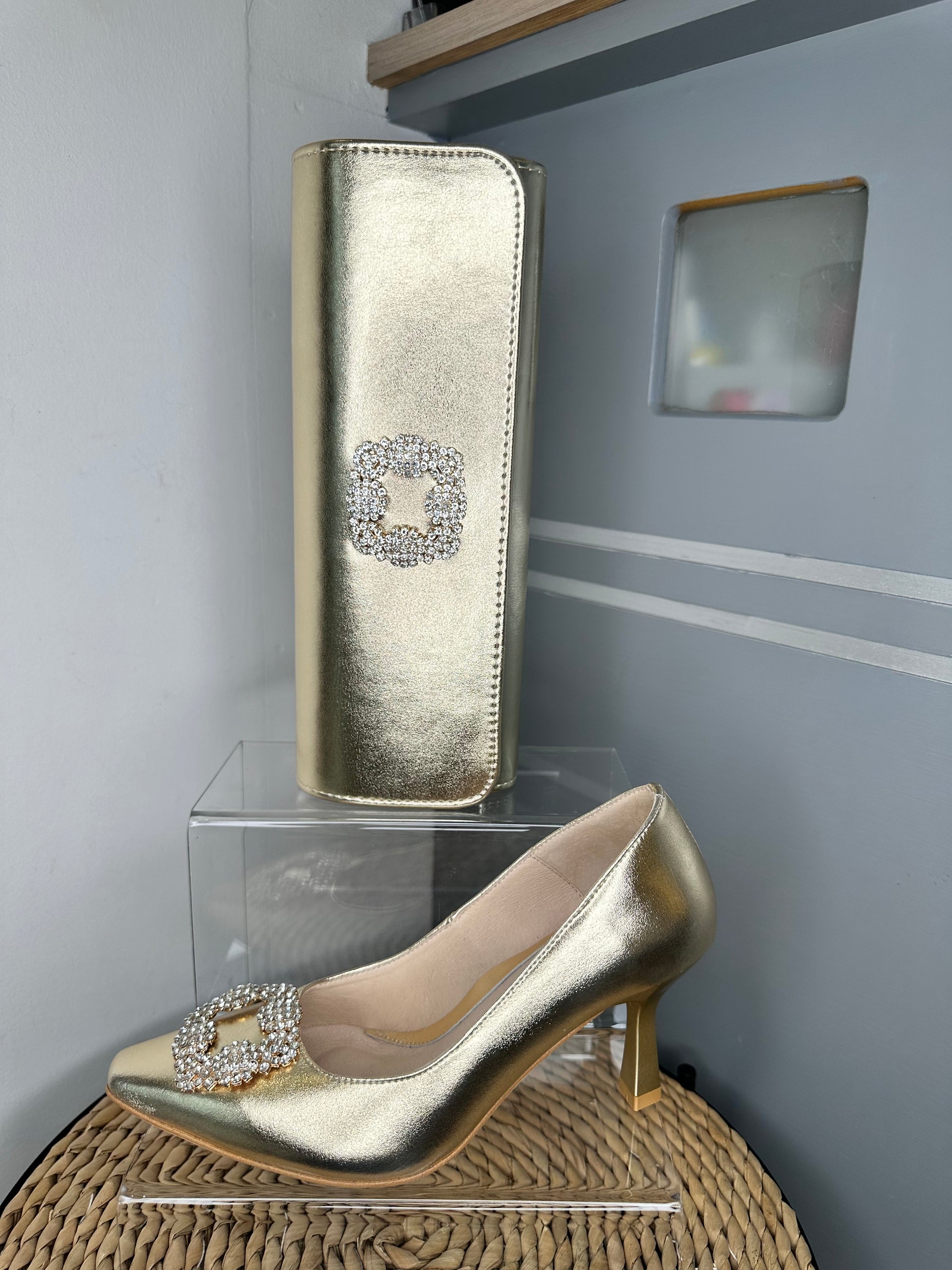 Matching clutch bag to our Emis -Metallic Gold Mid Heel Court Shoe With Square Diamante Trim (shoe style:S8259/042 )