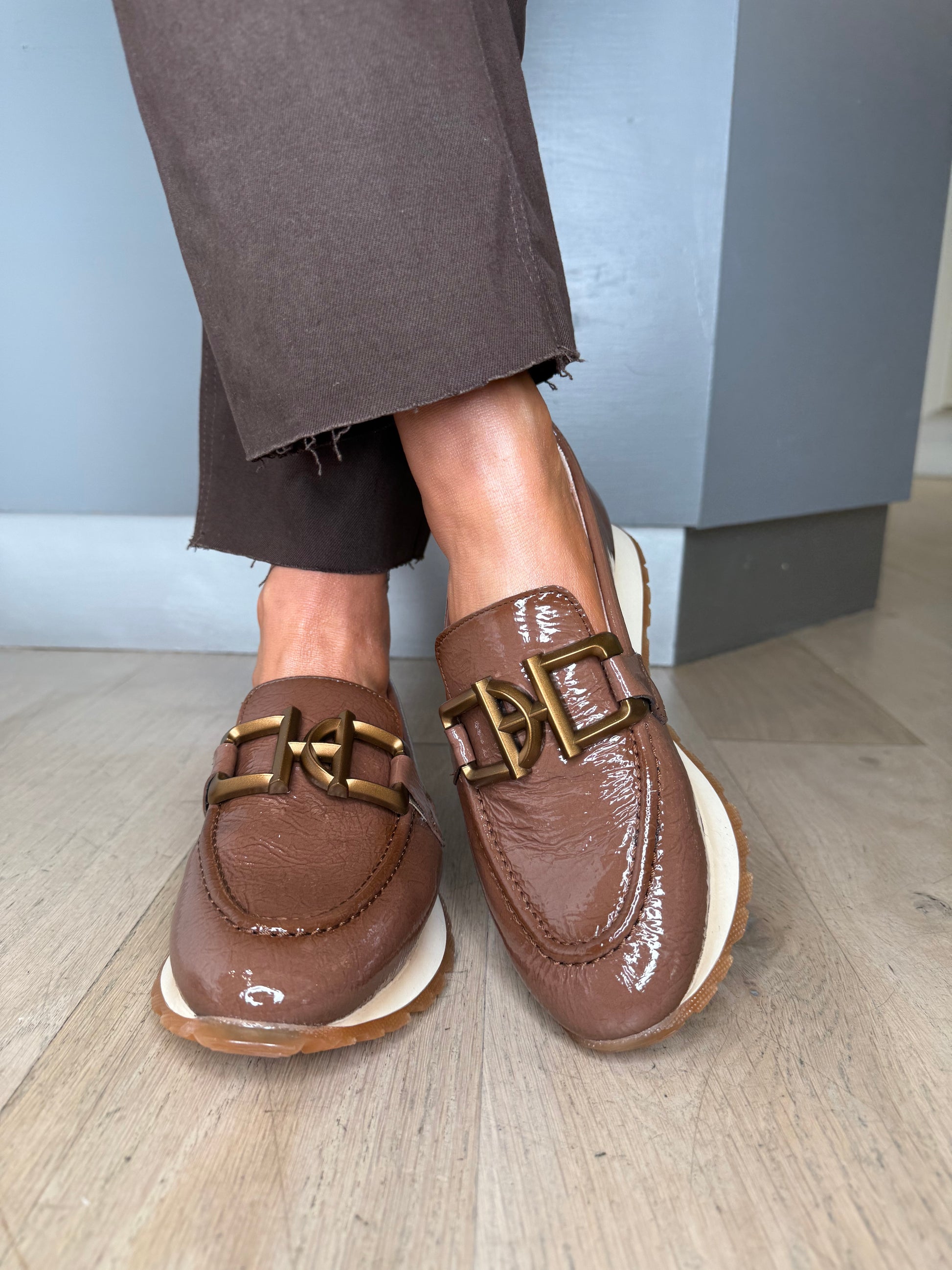 Crafted in a glossy mocha finish, they feature a statement soft bronze buckle across the front, blending elegancy with a modern, casual edge.