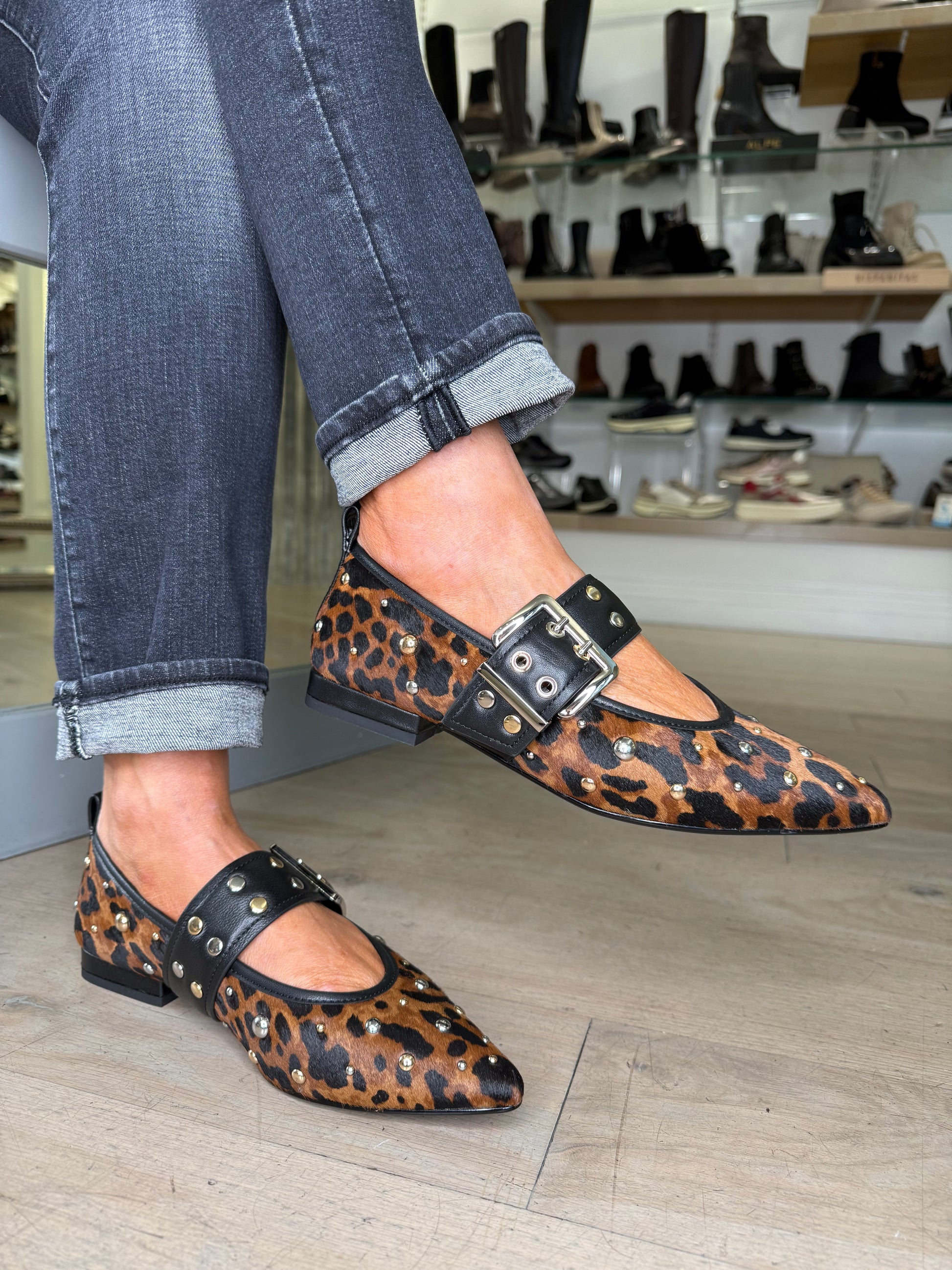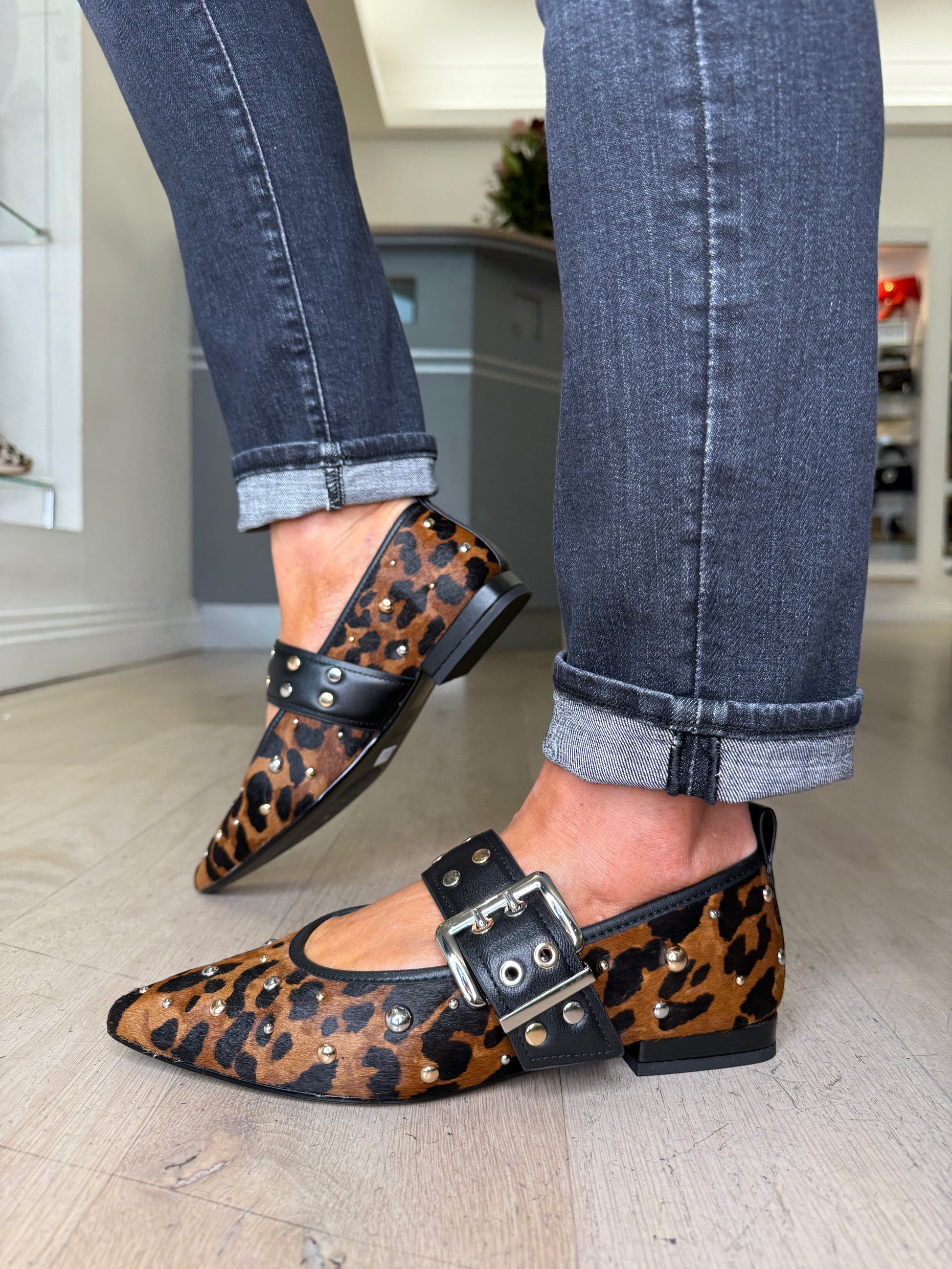WOW! Make a bold statement with these eye-catching leopard print pony-style leather shoes from Lodi. Designed with a sleek pointy toe and finished with edgy stud detailing, they're elevated further by a chunky buckle strap for that perfect mix of chic and contemporary style.
