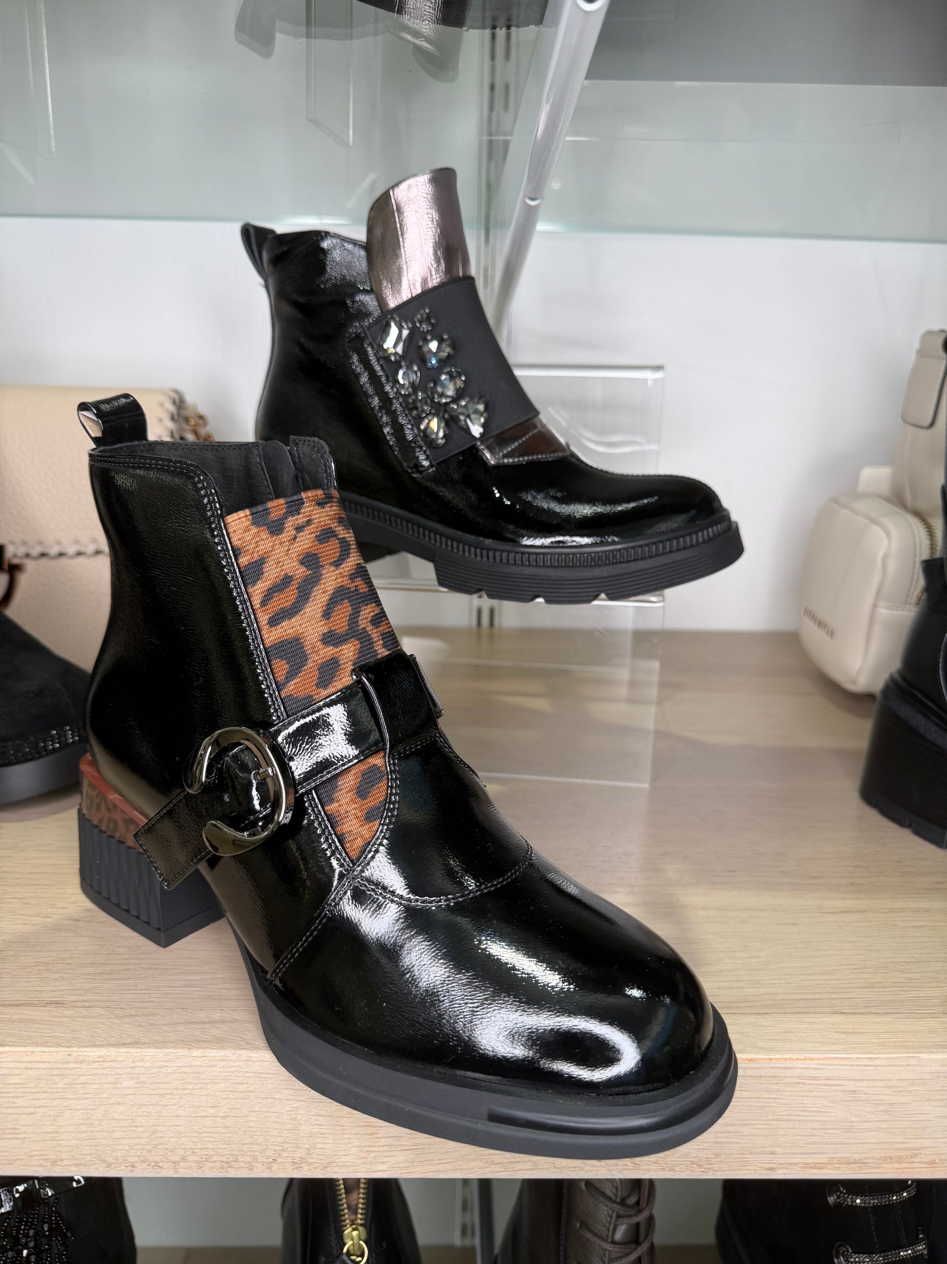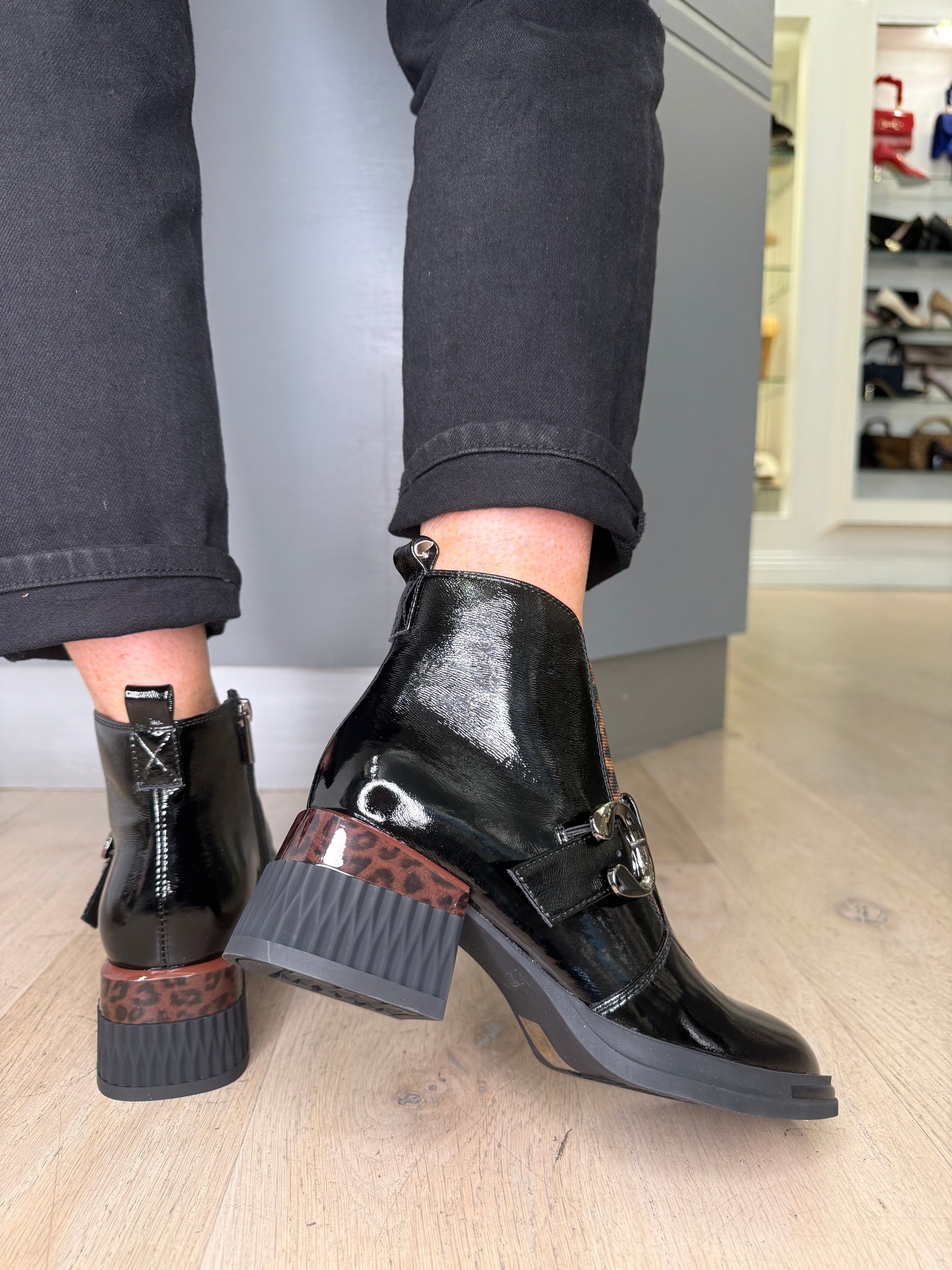 Loretta Vitale - Black Flexy Patent Boot With Leopard Print Trim & Block Heel
