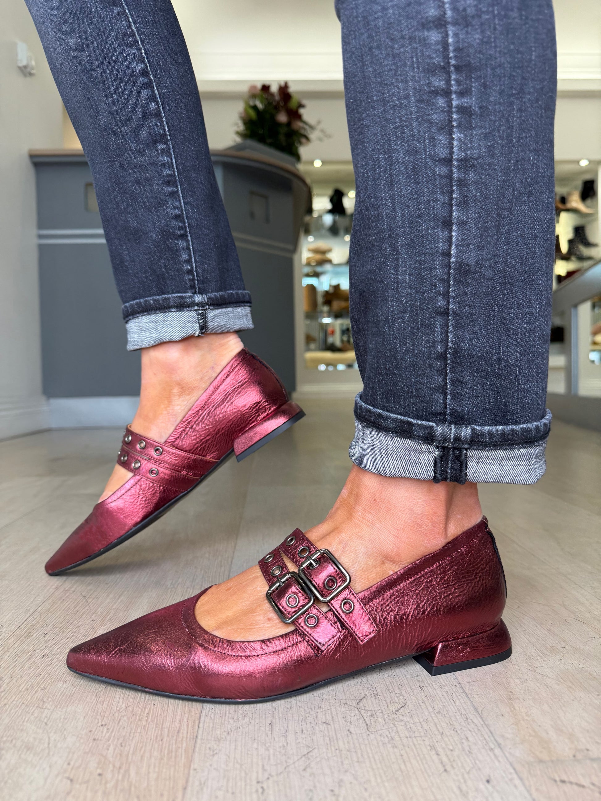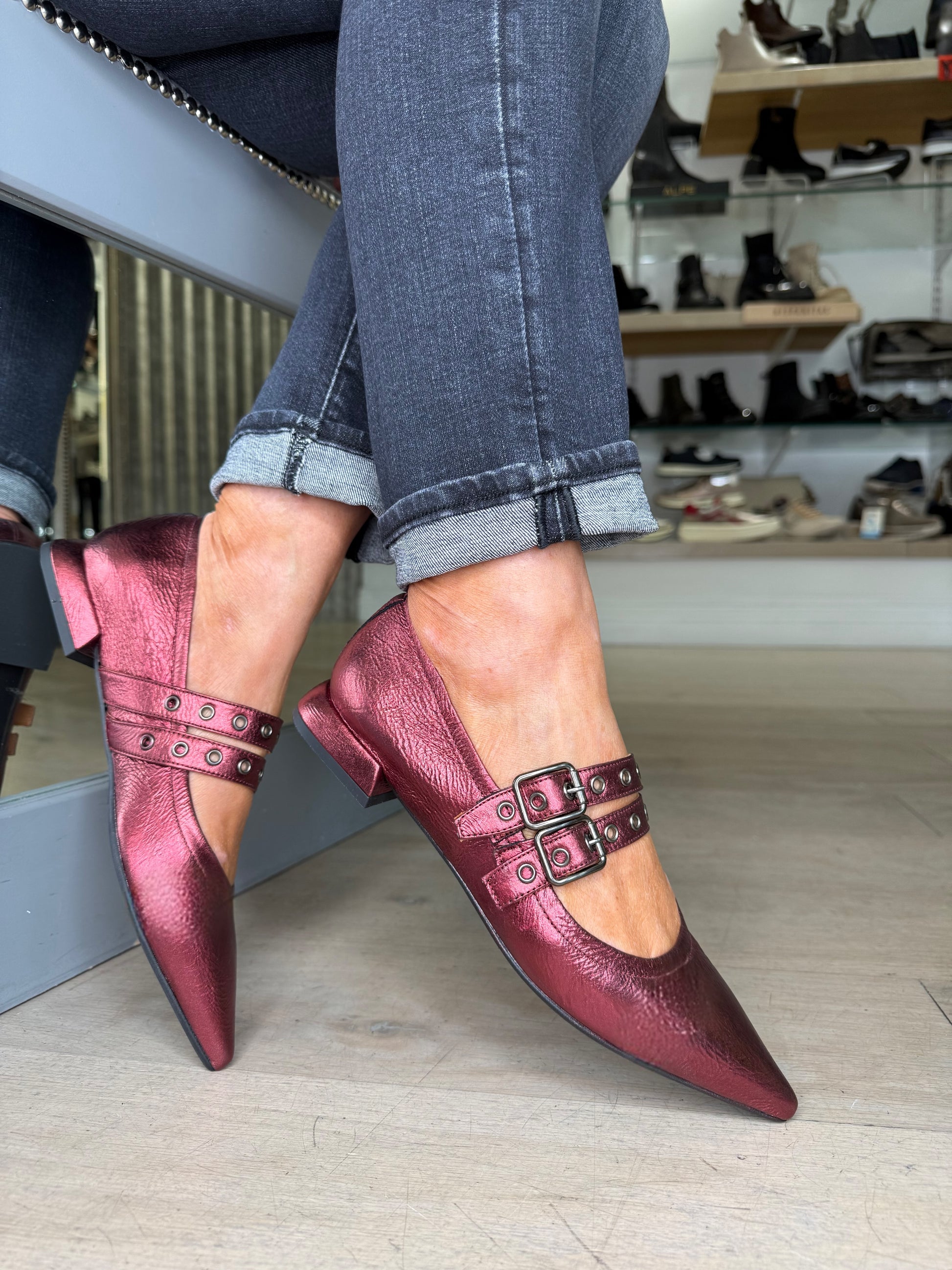Make a statement with the Marian double-buckle flat, where modern edge meets timeless elegance. Finished in a striking metallic wine coloured leather, these pointed-toe flats are designed to stand out while remaining effortlessly wearable. The twin buckle detail with antique-style hardware adds a touch of rock-chic personality, making them perfect for both day and evening looks!