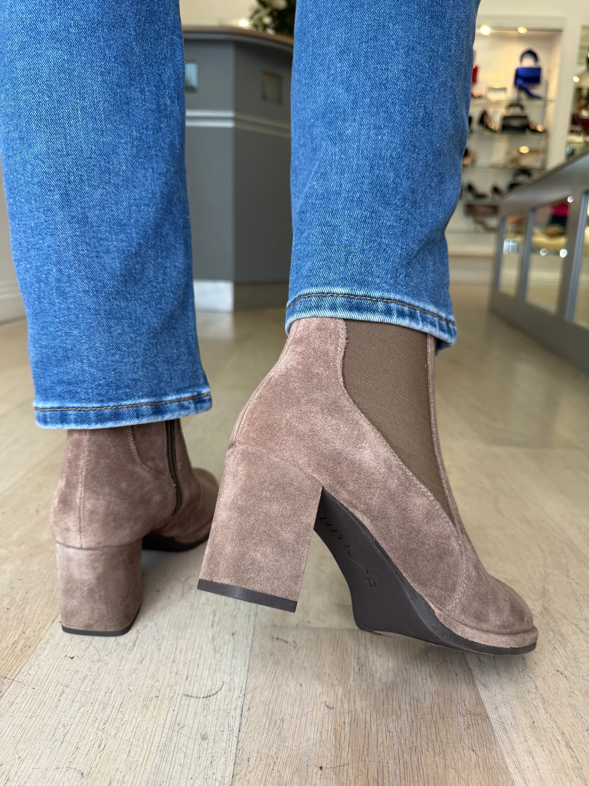 Crafted in a soft taupe suede, a kind of earthy distressed tone, it features a modern block heel that gives height without compromising on stability or comfort. The elastic side panels and inner zip make them easy to slip on, while ensuring a snug and flattering fit around the ankle. The fine platform to the front and their block heels makes them easy to walk in.